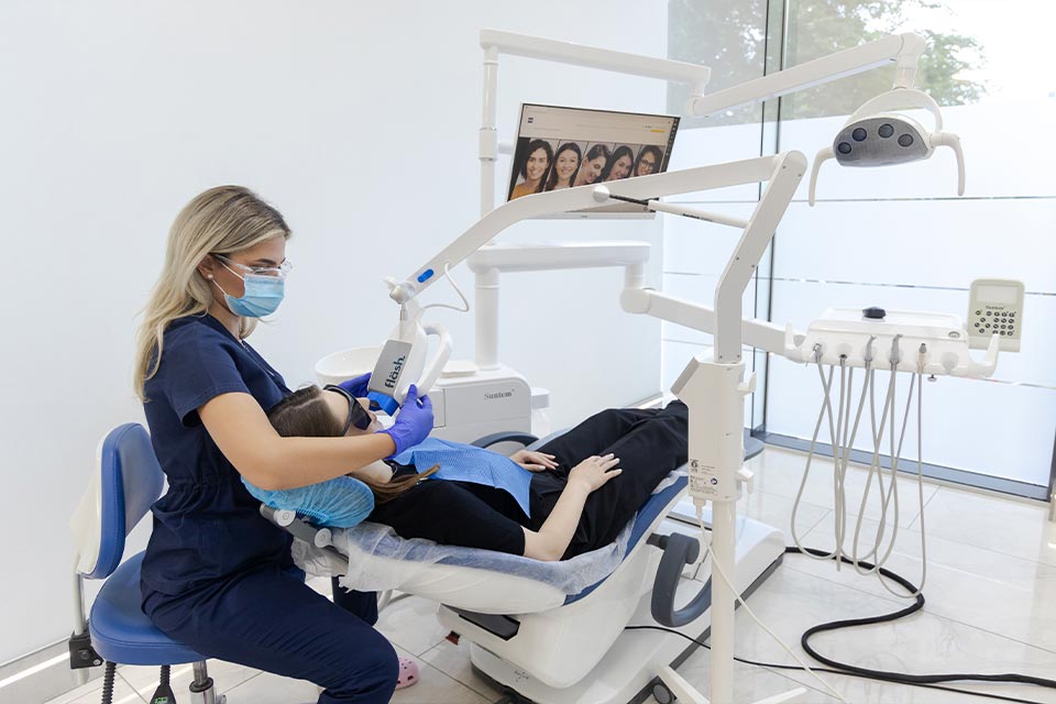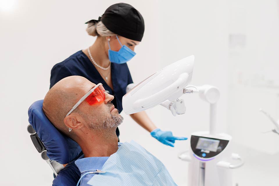 La Dentus•Dentino folosim lampa Beyond cu lumină rece. În timpul procedurii, gingiile sunt acoperite cu un material de protecție, iar dinții cu un agent de albire de înaltă calitate.