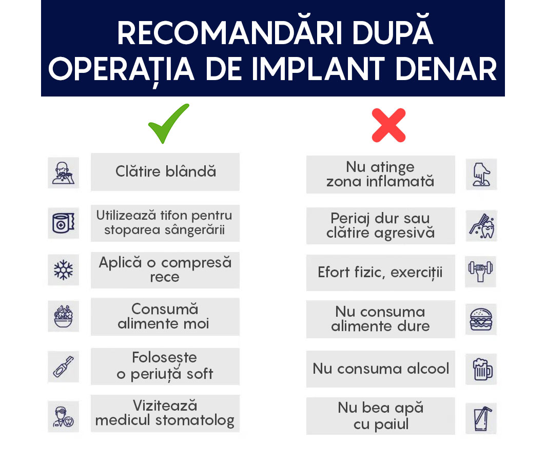 Tratarea durerii – la scurt timp după operația de implant dentar, anestezia va dispărea. Administrează medicamentele indicate de medic, pentru a ameliora intensitatea durerii.